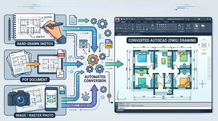Professional PDF, image, and sketch conversion services to AutoCAD that provide precise, fully editable, and high-quality CAD drawings.